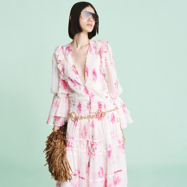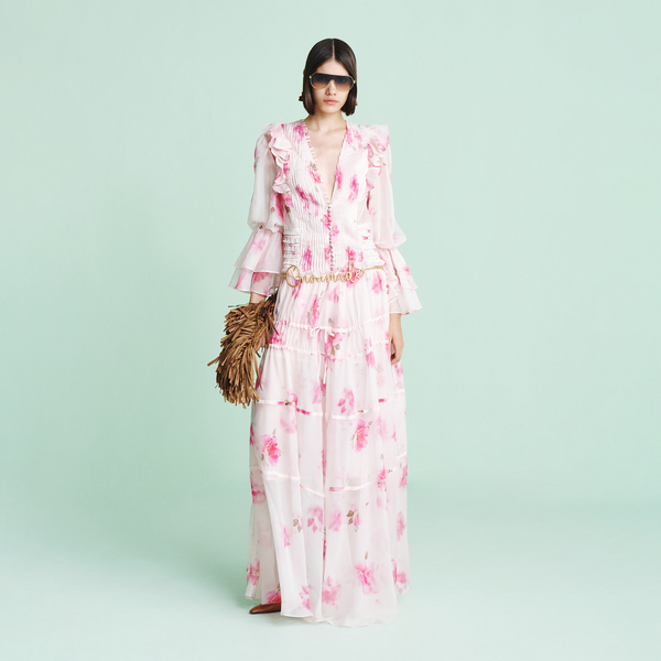 Mô tả sản phẩm: Phiên bản in hoa của mẫu Emorie Dress, với chất liệu voan mỏng in họa tiết loang màu hồng nhạt nổi bật. Thiết kế giữ nguyên cấu trúc với cổ V sâu, hàng nút bọc, tay dài bèo tầng và phần eo nhấn bằng các đường xếp ly cùng chi tiết rút dây nhẹ. Tà váy dài xếp tầng nhẹ, tạo độ bay khi di chuyển. Một lựa chọn tươi tắn, nữ tính cho những ngày hè nhiều nắng.