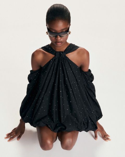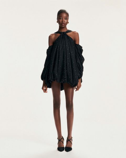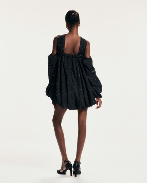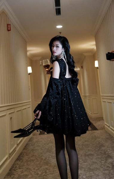 Mô tả: Thiết kế đầm đen từ vải thô đính đá cao cấp, may hai lớp với lót lụa bên trong, đảm bảo độ dày dặn và che chắn hoàn hảo. Form bí phồng đặc trưng của Ononmade, khéo léo che khuyết điểm vòng 1 và vòng 2, tạo cảm giác thanh thoát, nhẹ nhàng. Cổ áo xếp nếp nhún nhỏ, kết hợp dây vai luồn tinh tế giúp định hình phần thân áo và tôn dáng vai. Tay áo và cổ tay được xử lý nhún tạo độ phồng mềm mại, góp phần hoàn thiện tổng thể bồng bềnh nữ tính. Lưng thun co giãn phía sau giúp ôm dáng vừa vặn, cùng với tà đầm cắt tròn rộng, tăng cảm giác thoải mái và bay bổng khi di chuyển.